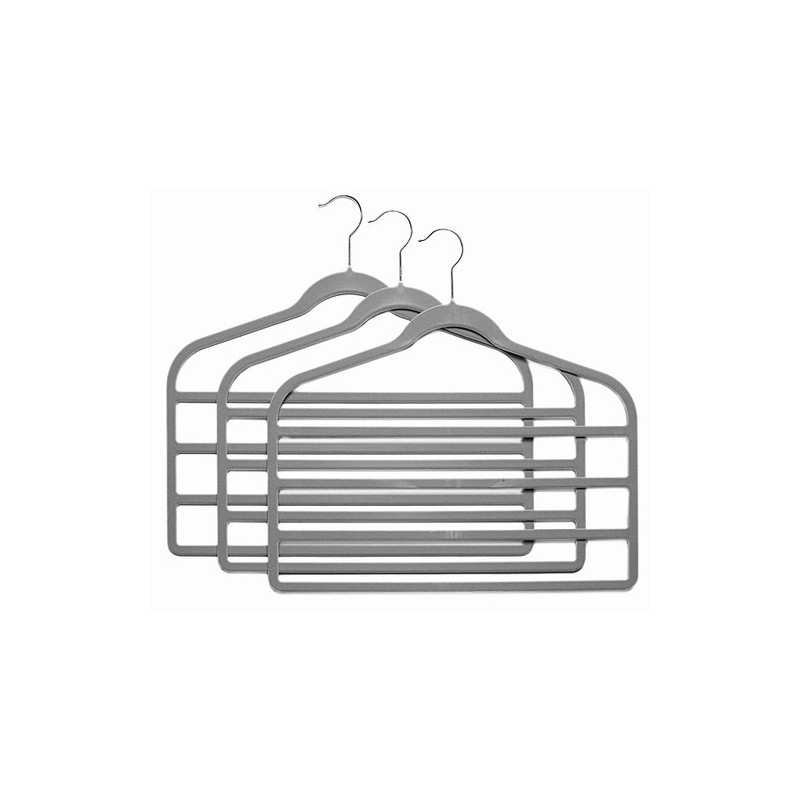 You'll love the flat design of these space saving pant hangers. The platinum velvet surface keeps pants and slacks from sliding while the 1/4" thick body will help you to save space in your closet or garment bag. These high quality clothes hangers make organizing and saving space a snap. Sold in boxes of (3) hangers.