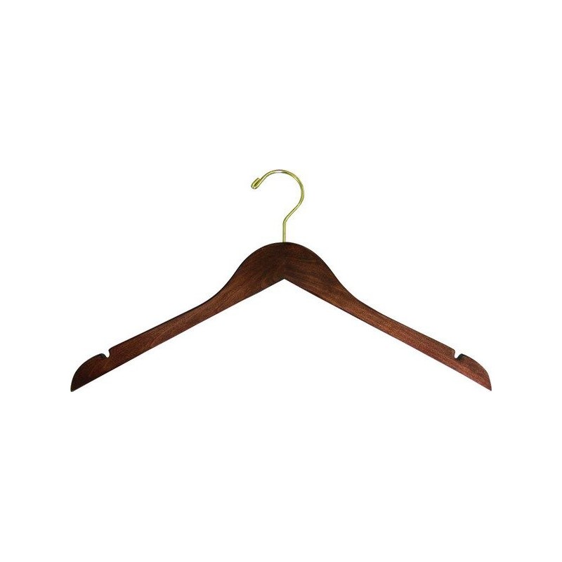 Flat Top Hangers feature a flat design highly desirable by store owners looking to make the most of their space. The notched shoulders keep garments with straps from shifting. The commercial grade polished brass swivel hook and layer after layer or clear lacquer over deep walnut stain will keep these clothes hangers looking and functioning as intended for a very long time. Sold in packs of 25, half boxes of 50, or full boxes of 100.
